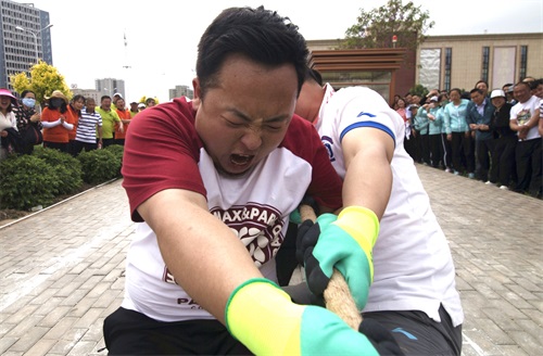 隨著一聲哨響,拔河比賽正式開(kāi)始,比賽中參賽隊(duì)員雙手緊握長(zhǎng)繩,大家都鉚足了勁兒、全力拼博,隨著長(zhǎng)繩子上紅色錘線的左右移動(dòng),場(chǎng)外加油聲、吶喊聲、歡呼聲連成一片,場(chǎng)面蔚為壯觀。